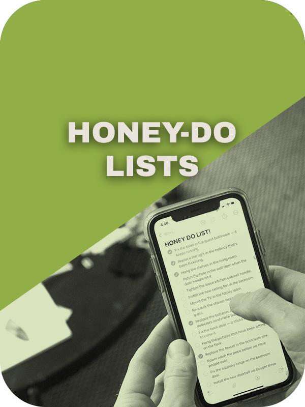 For Honey-Do lists I offer a HALF DAY ($650) or FULL DAY ($1200) rate to come over and complete that list of small things needing done aroudn the house.